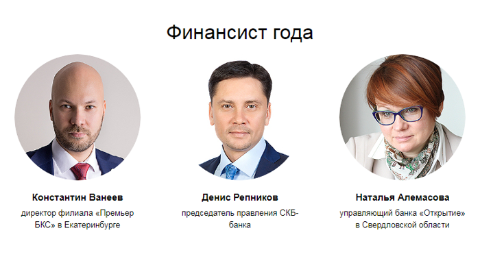 Названы номинанты премии «Человек года-2019» журнала «Деловой квартал» в Екатеринбурге. В номинации «Финансист года» на победу претендуют: директор филиала «Премьер БКС» в Екатеринбурге Константин Ванеев, председатель правления СКБ-банка Денис Репников, управляющий банка «Открытие» в Свердловской области Наталья Алемасова.
