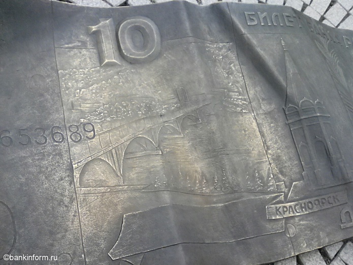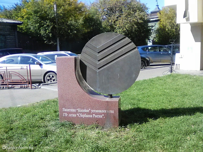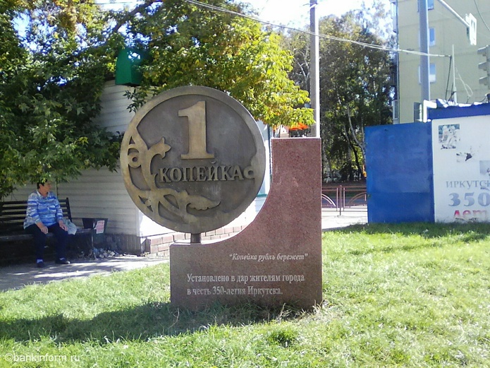 Начал с востока и с самого мелкого номинала. Вполне аутентичная копейка примерно метрового диаметра нашлась в Иркутске, на перекрёстке улиц Трилиссера и Байкальской. Надпись на основании напоминает, что «копейка рубль бережёт». Памятник установлен Сбербанком, и его оборотная сторона (которая, кстати, для монеты является как раз лицевой) остроумно стилизована под логотип.
