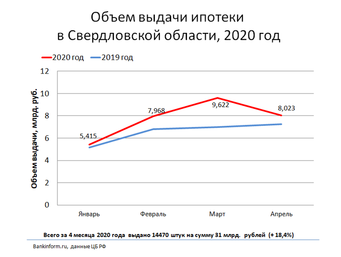 По итогам первых четырёх месяцев в Свердловской области выдано 14,5 тысяч кредитов на общую сумму 31 млрд рублей. Это на 18,4% больше, чем за аналогичный период прошлого года. По России в целом прирост составил 12,4%, объём ипотечных продаж - 965 млрд рублей.