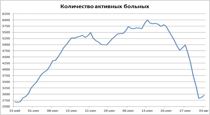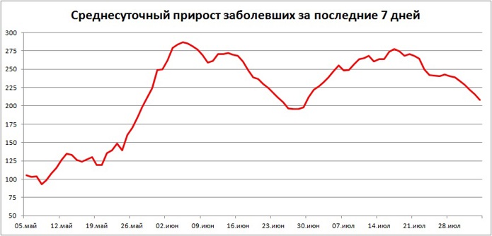 За минувшую неделю (27 июля - 2 августа) среднесуточный прирост заболевших коронавирусом в Свердловской области составил 208 ченловек, что значительно меньше, чем неделе ранее (243 человека). В субботу суточный прирост впервые с 26 июня оказался меньше 200 человек. Количество активных больных снизилось с пяти до трёх тысяч человек. На пике, в середине июля, оно достигало шести тысяч.