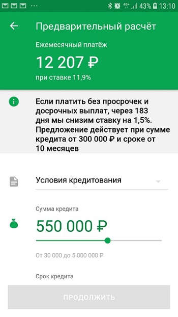 Пример: Если оформить 550000 рублей на 5 лет под 11,9% годовых, платеж составит 12207 рублей. Через 6 месяцев платеж снизится до 11579 рублей. Ставка будет равна 10,4% годовых