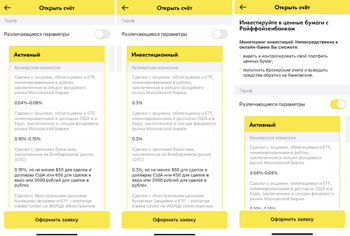 Для открытия счета в разделе «Новый продукт» нужно нажать вкладку «Открыть брокерский счет» и выбрать один из двух предлагаемых тарифов - «Активный» или «Инвестиционный». Сравнить их можно с помощью специальной кнопки, которая покажет разницу между двумя режимами.