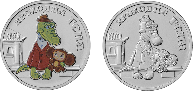 На недрагоценных монетах номиналом 25 рублей также изображены крокодил Гена и Чебурашка, слева от них - железнодорожная касса. Диаметр монет - 27 мм. Тираж монет с цветным покрытием - 150 тысяч штук, обычных - 850 тысяч.