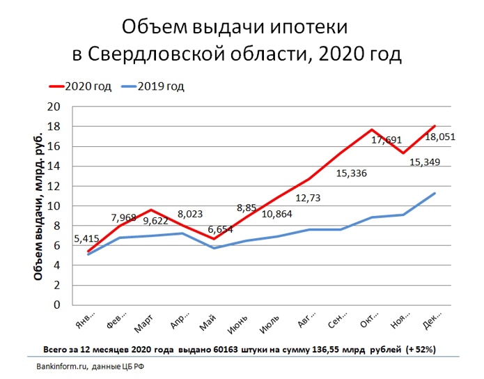 Всего в 2020 году свердловчане взяли 60153 ипотечных кредита на общую сумму свыше 136,5 млрд рублей. На графике показана помесячная динамика в сравнении с 2019 годом.
