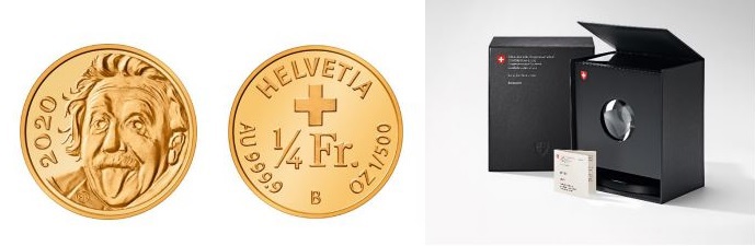 Золотая монета в четверть франка, посвященная учёному Альберту Эйнштейну, стала самой маленькой памятной монетой мира. Её диаметр - 2,96 мм, вес - 0,063 г. Надписи и детали изображения на такой крохотной монете невидимы невооружённым глазом, поэтому была разработана специальная упаковка с увеличительными линзами. Монета выпущена в январе 2020 года тиражом 999 штук.