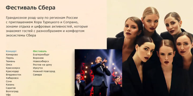 Летом в 20 крупнейших российских городах (разумеется, включая Екатеринбург) пройдёт фестиваль Сбера с музыкальной программой (анонсирован Хор Турецкого), развлечениями и демонстрацией сервисов экосистемы.