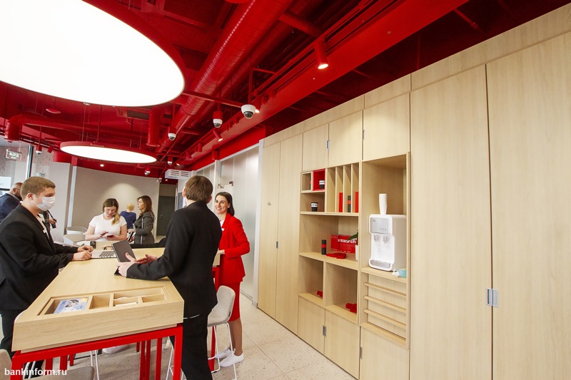 Что же собой представляет рhygital-офис? Само помещение стильно выполнено в красно-белых тонах. Нет стоек для сотрудников и отдельной рабочей зоны, что значительно расширяет доступное клиенту пространство.