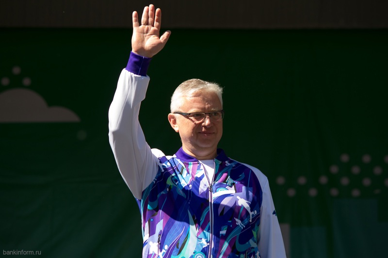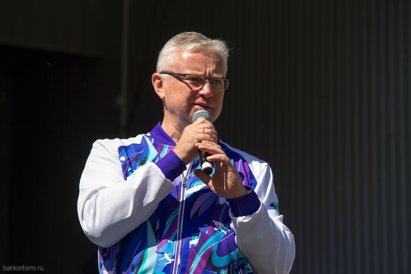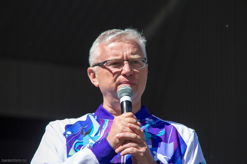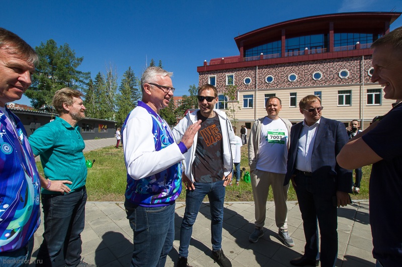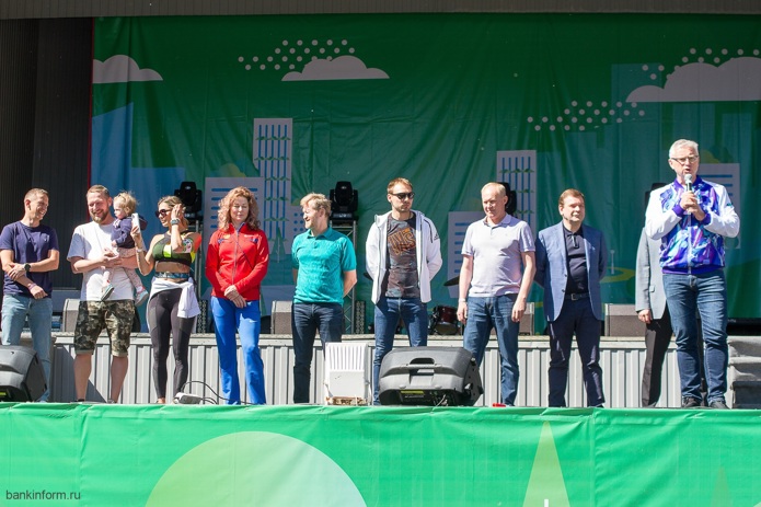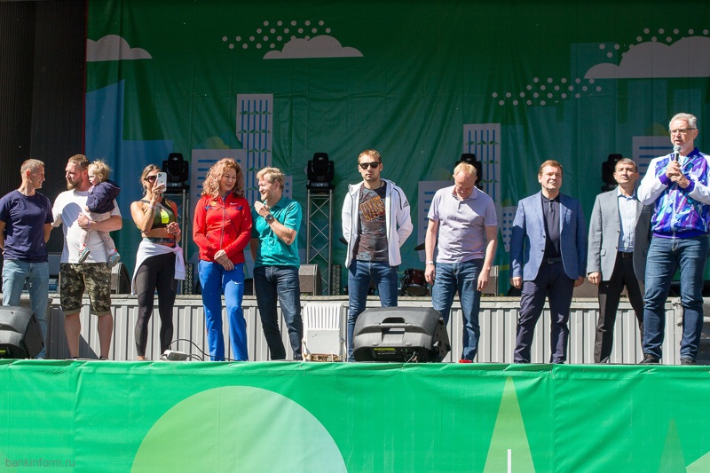 Открытие Зелёного марафона. Слева направо: спортсмены Иван Алыпов, Юрий Прилуков, Олеся Красномовец, Ольга Котлярова, актёр Сергей Рожков, спортсмены Антон Шипулин и Сергей Чепиков, заместитель регионального министра физической культуры и спорта Александр Маслов, заместитель главы Екатеринбурга Дмитрий Ноженко , председатель Уральского банка Сбербанка Дмитрий Суховерхов (с микрофоном).