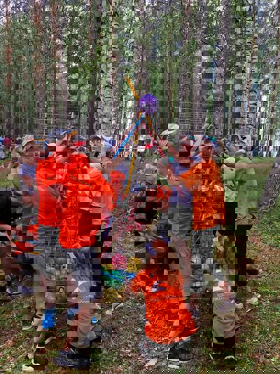 Одна из самых сложных задач - поднять палками шар со дная и вытолкнуть наружу. Зато идеальный командный тренинг!