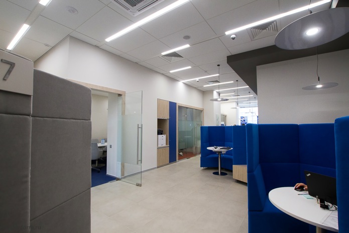 Вскоре на телефон приходит сообщение с номером зоны, в которой его ждёт сотрудник. Именно зоны - стоек и традиционных «окон» здесь нет, их заменили столики и мягкие двойные диваны с высокими спинками (чтобы никто не подглядывал!). Внешне такая зона напоминает купе поезда в вагоне класса СВ. Часть зон предназначена для конфиденциальных вопросов и находится в закрытых переговорных - такие походят на купе ещё больше, разве что окошек нет.