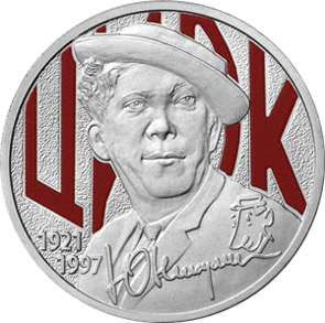 Тем же номиналом выпущены недрагоценные монеты с портретом Никулина на фоне надписи "Цирк" и изображением его автографа. Часть тиража - 150 тысяч из миллиона - сделана в цвете, хотя на первый взгляд этого можно и не заметить: раскрашена только надпись "Цирк".