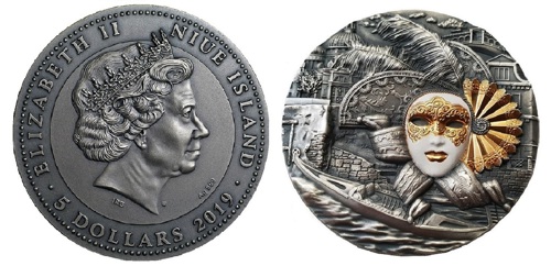 Серебряная монета «Венецианская маска» 2019 (Ниуэ) 62.2 г (проба 999)