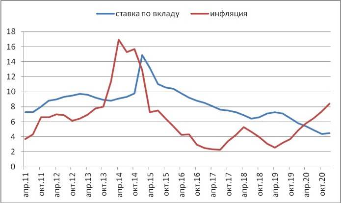 1) Прежде всего, если уж сопоставлять депозитный доход и инфляцию, нужно делать это правильно. Инфляция в годовом выражении - это рост цен за предыдущие 12 месяцев, а при открытии годового вклада мы фиксируем ставку на следующие 12 месяцев. То есть, сравнивать нынешнюю инфляцию в 17,7% (данные на 27 апреля) с нынешними ставками по вкладам бессмысленно. За последний год вклады однозначно проиграли инфляции, и наша задача - взять реванш, отбить потери в будущем.
