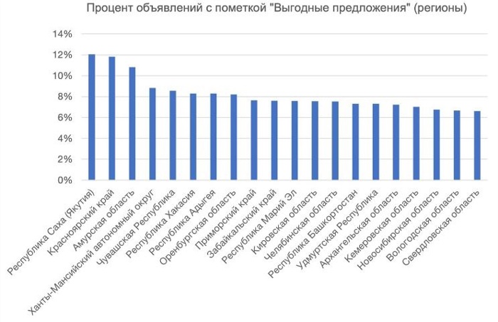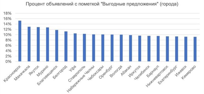 * Методология исследования: рассматривались города, в которых опубликовано более трех тысяч объявлений (для регионов - более пяти тысяч). Была рассчитана доля объявлений со стикером «Выгодное предложение» и произведена сортировка городов по убыванию.