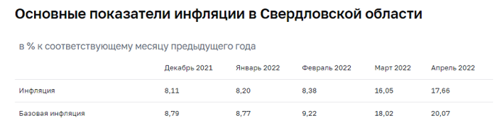 В целом инфляция в Свердловской области в апреле осталась ниже средней по России (17,83%), но выше, чем по УрФО (15,21%).
