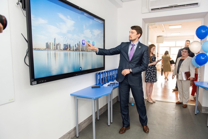 Дизайн аудитории выдержан в мягких голубых и белых тонах - фирменных цветах ВТБ. Имеются здесь и его логотипы. Класс оснащён модульными партами, современной техникой и интерактивной панелью сетевого взаимодействия.