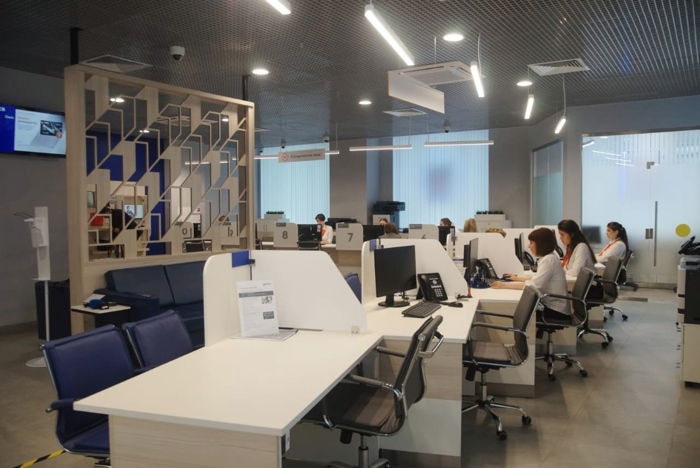 Отделение спроектировано в современном стиле, с учётом технологических условий для обслуживания клиентов. Дизайн офиса выполнен в сине-белых тонах. Есть комфортная зона ожидания и переговорные кабины.