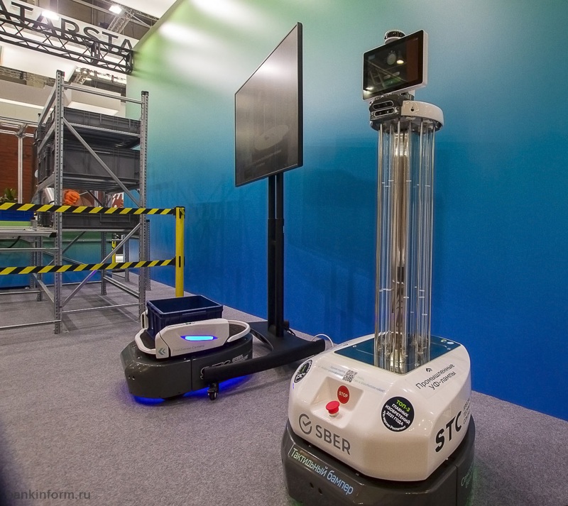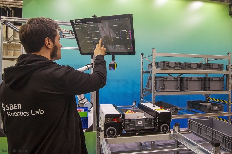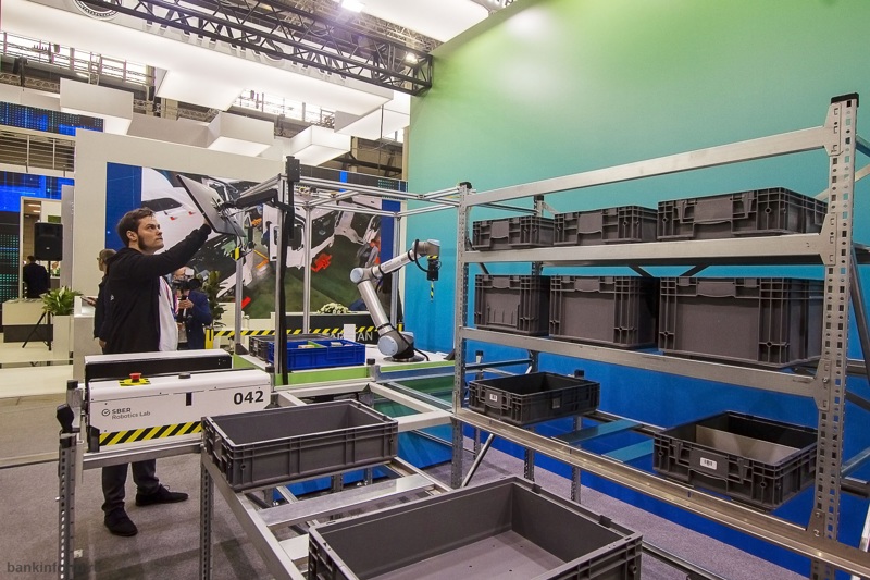 На ИННОПРОМЕ-2022 Сбер продемонстрировал свою новейшую разработку по автоматизации складской логистики в индустрии электронной коммерции — роботизированную систему SberShuttle.