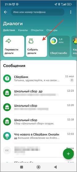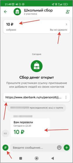 Любой участник нажимает на ссылку и, авторизовавшись в Сбербанк Онлайн, сразу попадает в этот диалог. Получается такой общий чатик, где участник может оставить сообщение или нажать зелёную кнопку знака рубля в нижнем левом углу и перевести деньги.