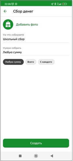 5. Указываем сумму. Можно собирать конкретную или неограниченную («любую») сумму. Также можно задать размер взноса для каждого участника. Нажимаем Создать.