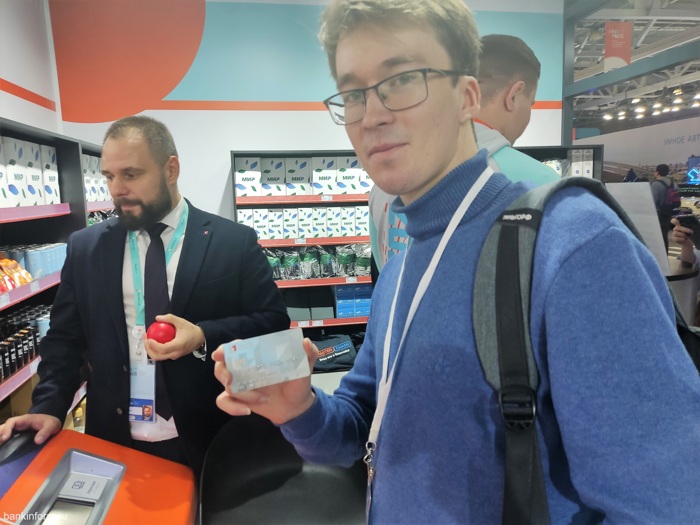 У биометрического терминала «Атроник», пройдя Face Id, можно было «просто так» пополнить демокошелёк на 100 цифровых рублей. Такие терминалы стояли у каждого стенда, поэтому кошелёк нашего героя постоянно пополнялся.