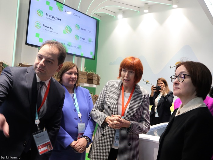 Пока Диме рассказывали про Госключ, к стенду Россельхозбанка подошла Эльвира Набиуллина. Ей тоже было интересно.