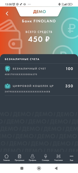 Посетители форума стали первыми, кто протестировал цифровой рубль в деле. Все желающие могли в мобильном приложении «почти настоящего» Банка Финоленд открыть цифровой демокошелёк и проводить различные операции: конвертировать рубли с безналичного счёта, переводить другим участникам, пополнять кошелёк и, конечно, оплачивать покупки.