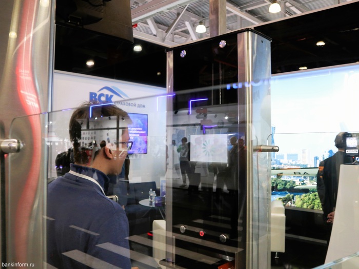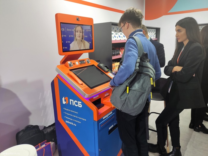 Далее Дмитрий набрёл на мини-офис ПСБ. На вид почти обычный банкомат, но с его помощью можно воспользоваться всеми услугами банка, даже не являясь его клиентом (идентифицировавшись через ЕБС). Провести любую операцию поможет банковский сотрудник, находящийся на видеосвязи. Здесь можно выпустить неименную пластиковую карту с пинкодом (она вылезет прямо из банкомата), оформить вклад, кредит и т. п. Отличное, конечно, изобретение, но будет ли востребовано?