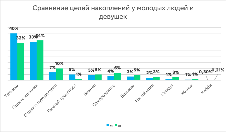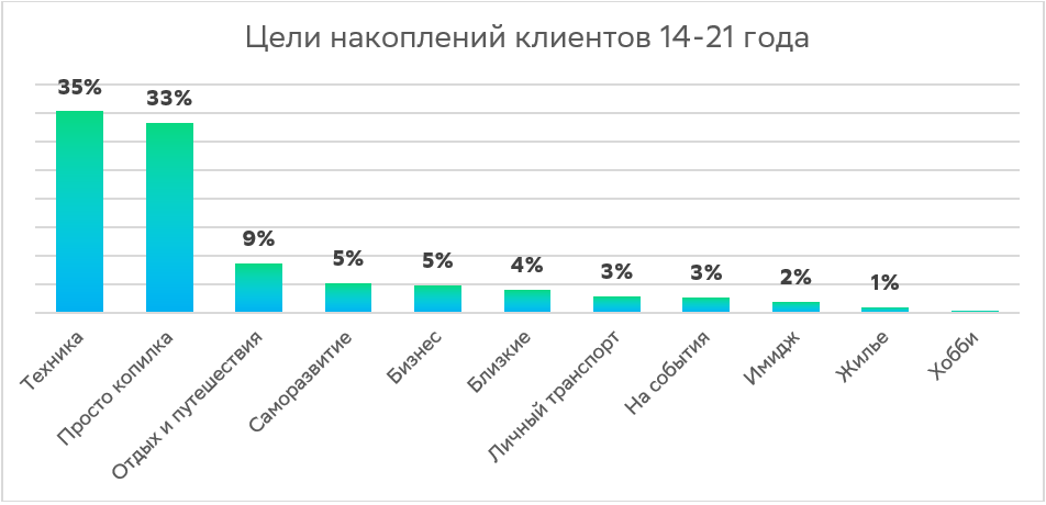 Чаще всего молодёжь копит на технику: на неё откладывают деньги 35% молодых людей. На втором месте - сбережения без определённой цели («на всякий случай») - 33%. Далее идут отдых и путешествия (9%), саморазвитие и бизнес (по 5%), близкие (4%), личный транспорт и события (по 3%), имидж (2%), жильё (1%) и хобби (меньше 1%).