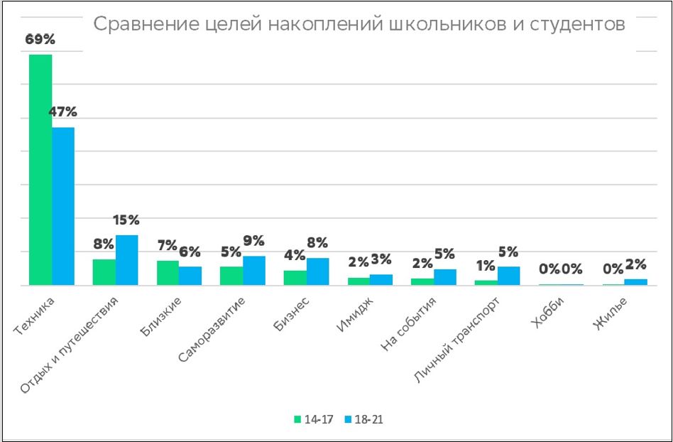Кроме того, в банке проанализировали, как отличаются цели накоплений у подростков 14-17 лет и молодёжи от 18 лет до 21 года (из графиков исключены нецелевые накопления). У подростков с огромным отрывом (69%) лидирует техника, а у 18-21-летних отрыв намного меньше (47%). Ребята постарше чаще откладывают на путешествия (15 и 8%), саморазвитие (9 и 5%), бизнес (8 и 4%), события (5 и 2%), личный транспорт (5 и 1%) и жильё (2 и 0%).