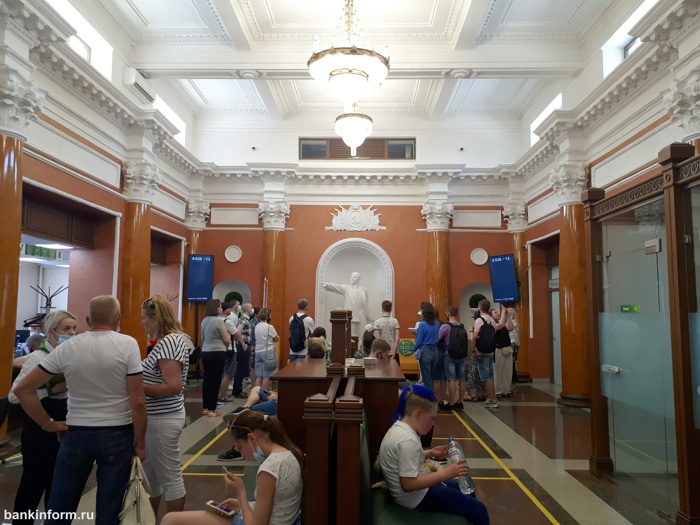Далее нас проводили внутрь здания, где несмотря на экскурсию, продолжалась планомерная работа. Экскурсовод заговорил тише, чтобы не нарушить привычный темп работы сотрудников банка. Внутренности офиса поразили своим величием: высокие потолки, хрустальные люстры, замысловатые барельефы и лепнина будто переместили нас в прошлое. Интерьер сохранили таким же, как и в далёком сорок первом году, когда здание было воздвигнуто. В конце длинного коридора мы увидели статую Ленина, которая находилась в офисе с самого его основания, она символизирует преемственность поколений. Ленин будто контролирует весь процесс работы и внимательно следит за каждым из сотрудников.