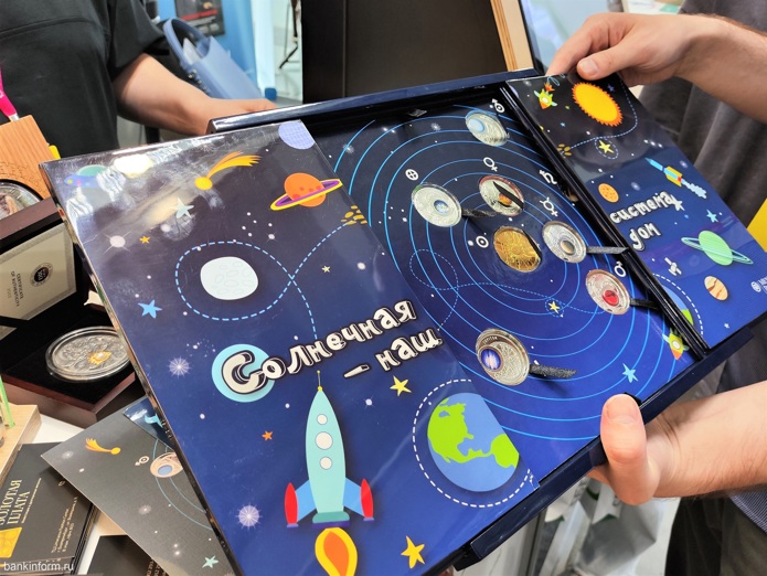 Естественно, помимо пяти монет, размещённых в автомате, «Золотая плата» на ИННОПРОМ-2023 демонстрирует и продаёт множество других. В их числе такие уникальные образчики как белорусский комплект «Солнечная система», в котором каждой планете посвящена своя монетка, или барбадосская монета «Земля -замороженная планета», выполненная в виде маленького глобуса.