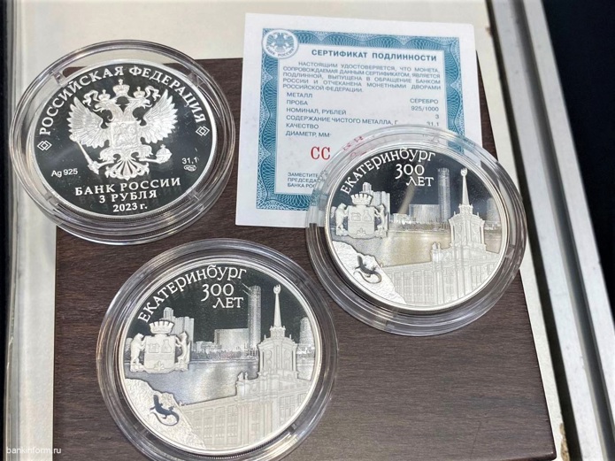 Накануне 300-летнего юбилея Екатеринбурга стоит припомнить, как наш город попадал на памятные монеты. И, конечно, начать с монеты, посвящённой непосредственно юбилею - она так и называется «300-летие Екатеринбурга». Этот серебряный трёхрублёвик выпущен не далее как в июле, успел побывать на выставке ИННОПРОМ и попасть в Музей истории города, а при желании его пока ещё можно купить (естественно, не в музее - наличие уточняйте здесь).