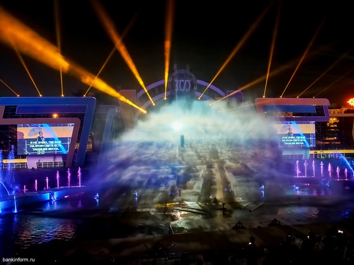 По крайней мере, так утверждают в СберБанке. Вероятно, речь идёт не о высоте, на которую возносится вода (хотя она и внушительная - 25 метров, но саратовский фонтан «Сердце Волги» будет повыше, и даже странно, что его построил не Сбер), а о размерах - 110 на 15 метров. В воздух одновременно выбрасываются 245 струй.