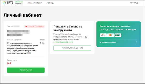 1. Зарегистрироваться на портала ЕКАРТА. Школьные сервисы. После регистрации, в личном кабинете сервиса отобразится информация по личным счетам ваших детей-школьников. Если такой информации нет, то, скорее всего, номер телефона, под которым вы зарегистрировались на портале, не указан в качестве номера телефона законного представителя учащегося в школьной системе. Нужно обратиться в школу для решения этой проблемы. В этом случае пополнять баланс можно по номеру лицевого счёта учащегося, который указан в бумажной квитанции на oплату питания.