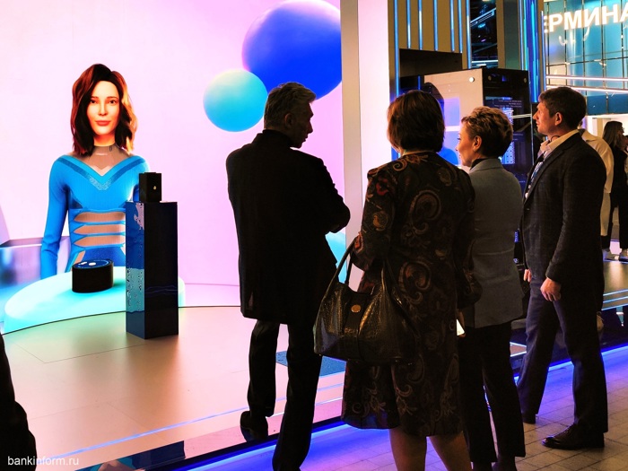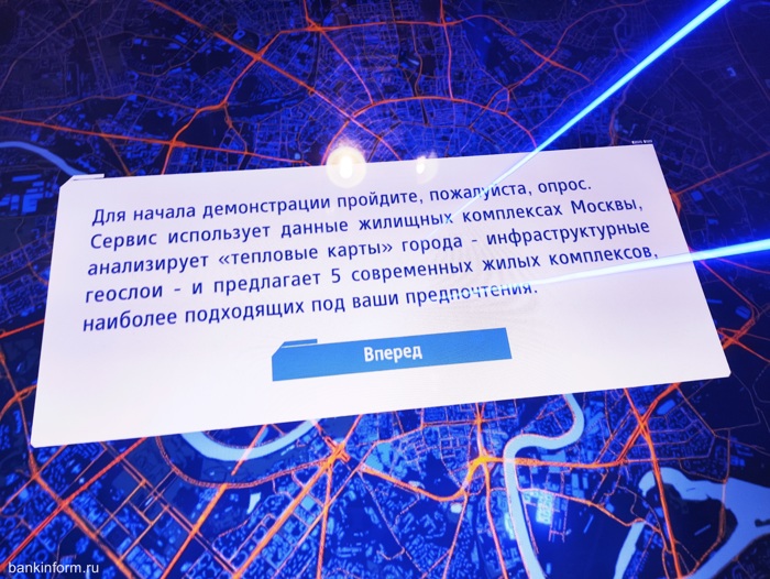 На стенде ВТБ искусственный интеллект выбирал жильё. Не себе, а всем желающим - умная программа на основе небольшого опроса (возраст, наличие детей, желаемая продолжительность дороги на работу и пр.) подбирает новостройки из доступного ей списка и накладывает их на карту важной для данного человека московской инфраструктуры. При увеличении списка вариантов опрос может стать более подробным, но это всё равно быстрее, чем самостоятельно сопоставлять информацию. Польза сервиса очевидна.