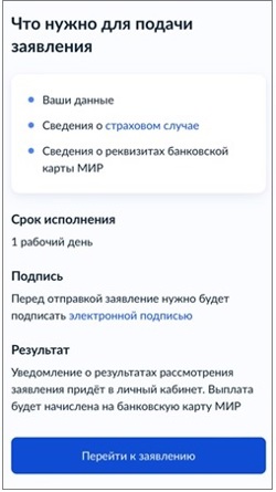 Моё общее впечатление: сложно найти услугу в приложении Госуслуг (пришлось искать через чат-бота или через функцию поиска), потом всё было легко и понятно. С введением реквизитов карты также возникли сложности.