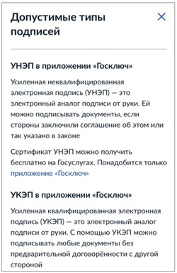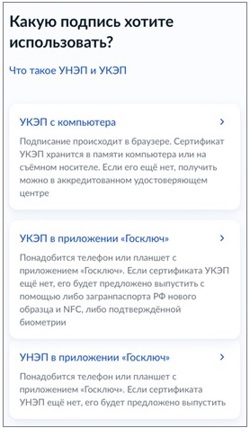 7. Выбираем вид электронной подписи. Я выбрала «УНЭП в приложении «Госключ», так как в телефоне у меня есть приложение Госключ.