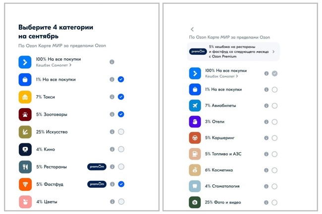 2. Если есть подписка Ozon Premium, то в наборе из 8 категорий на выбор всегда будут 5% на Фастфуд и на Рестораны (здесь это отдельные категории!).