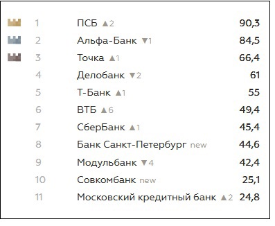 Лидером по качеству цифрового клиентского опыта впервые стал ПСБ. Второе и третье место у Альфа-Банка и Точки соответственно.
