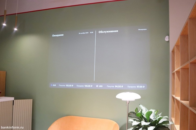 На электронном табло - проекции на стене - отображается номер клиента и фотография назначенного ему менеджера.