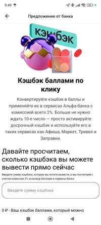 Обычно накопленный кэшбэк поступает на счёт 10-го числа каждого месяца, после чего его можно вывести в рубли. Однако с помощью новой опции можно воспользоваться накопленным кэшбэком, не дожидаясь 10-го числа, но не в виде рублей, а в виде баллов. Комиссия за операцию составит 2%.