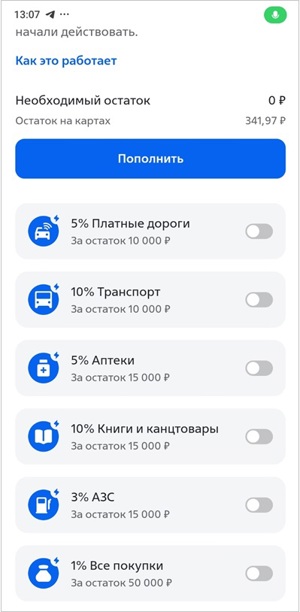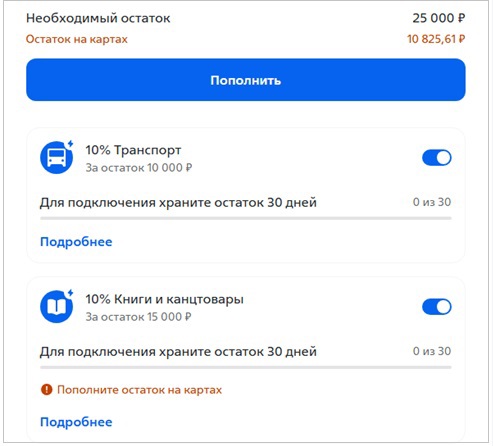 Дополнительные категории активируются в том случае, если клиент поддерживал остаток на своём карточном счёте не ниже определённого уровня. Неснижаемый остаток зависит от категории: так, для получения кэшбэка на транспорт он составляет 10 тысяч рублей, а для кэшбэка на все покупки - 50 тысяч рублей.