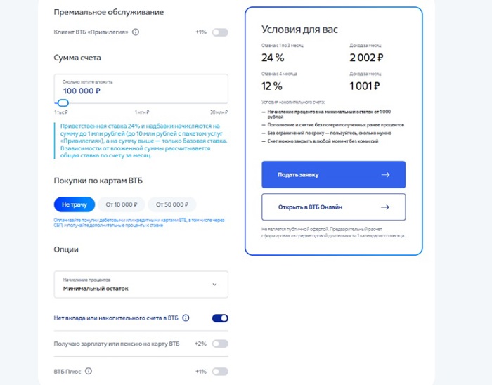 Так, к примеру, в ВТБ доходность по счету 24% годовых доступна на первые три месяца и при условии, что ранее вы не открывали накопительные счета (или в последние 180 дней остатки были менее 1000 рублей). А базовая ставка находится на уровне 12% годовых. Ее можно увеличить, совершая траты по картам либо оформив подписку. Также на надбавку к базовой ставке могут рассчитывать зарплатные и пенсионные клиенты.
