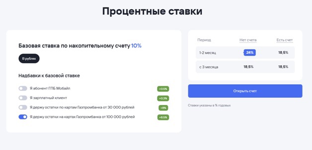 В Газпромбанке приветственную ставку можно получить только на сумму до 1,5 млн рублей. Если сумма превышает этот лимит, то на сумму превышения действует базовая ставка в размере 10%. Кстати, эту ставку также можно увеличить до 18,5% годовых. Для этого не нужно оформлять подписку или совершать покупки, а просто держать на картах Газпромбанка остатки от 100 тыс. рублей.