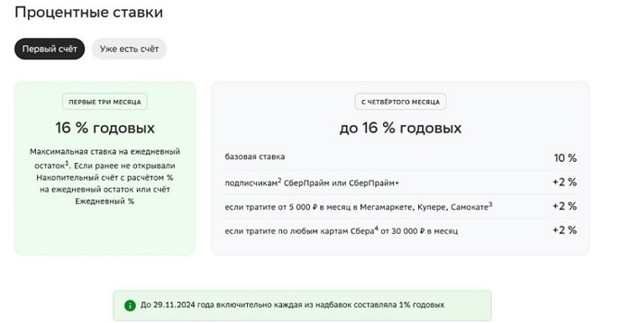 В Сбербанке доходность по счету в 16% годовых доступна только на первые три месяца и при условии, что ранее вы не открывали накопительные счета. А базовая ставка находится на уровне 10% годовых. Надбавки можно получить за оформление подписки СберПрайм и траты по карте.