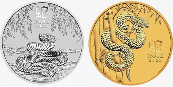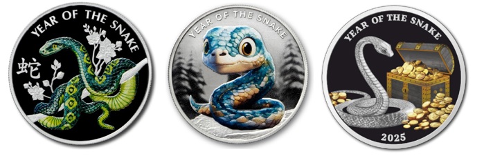 А также австралийские золотые и серебряные монеты «Год Змеи» 2025 серии «Лунный календарь-III» разных номиналов: