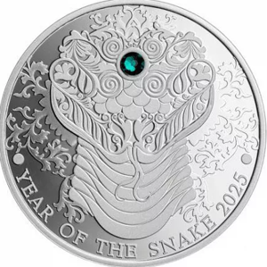 Кроме того, в продаже появилась серебряная монета «Год Змеи» (Гана, 15,55г) с изображением стилизованной змеи с вставкой из зелёного кристалла: