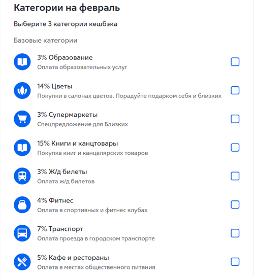 Зарплатные клиенты выбирают 4 категории. Также 4 категории могут выбирать клиенты, которые настроили автопополнение по СБП на сумму от 9 тыс. рублей в месяц.