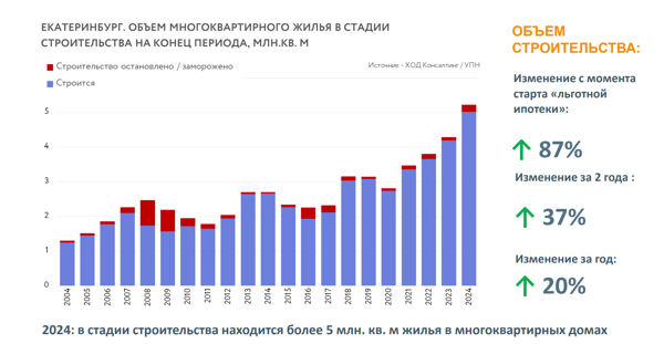 В 2025 год мы зашли с рекордно высоким объемом строительства. Еще никогда в городе не строилось так много жилья, и никогда в предыдущие годы не было такого длительного цикла подъема рынка. По сути, с 2017 года рынок новостроек показывает рост в объемах почти без остановки. Была небольшая инвестиционная пауза в 2020 году в начале пандемии, но она быстро завершилась. Была запущена льготная ипотека, и стройка очень сильно выросла. Сейчас в Екатеринбурге в стадии строительства находится более 5 млн квадратных метров жилья.